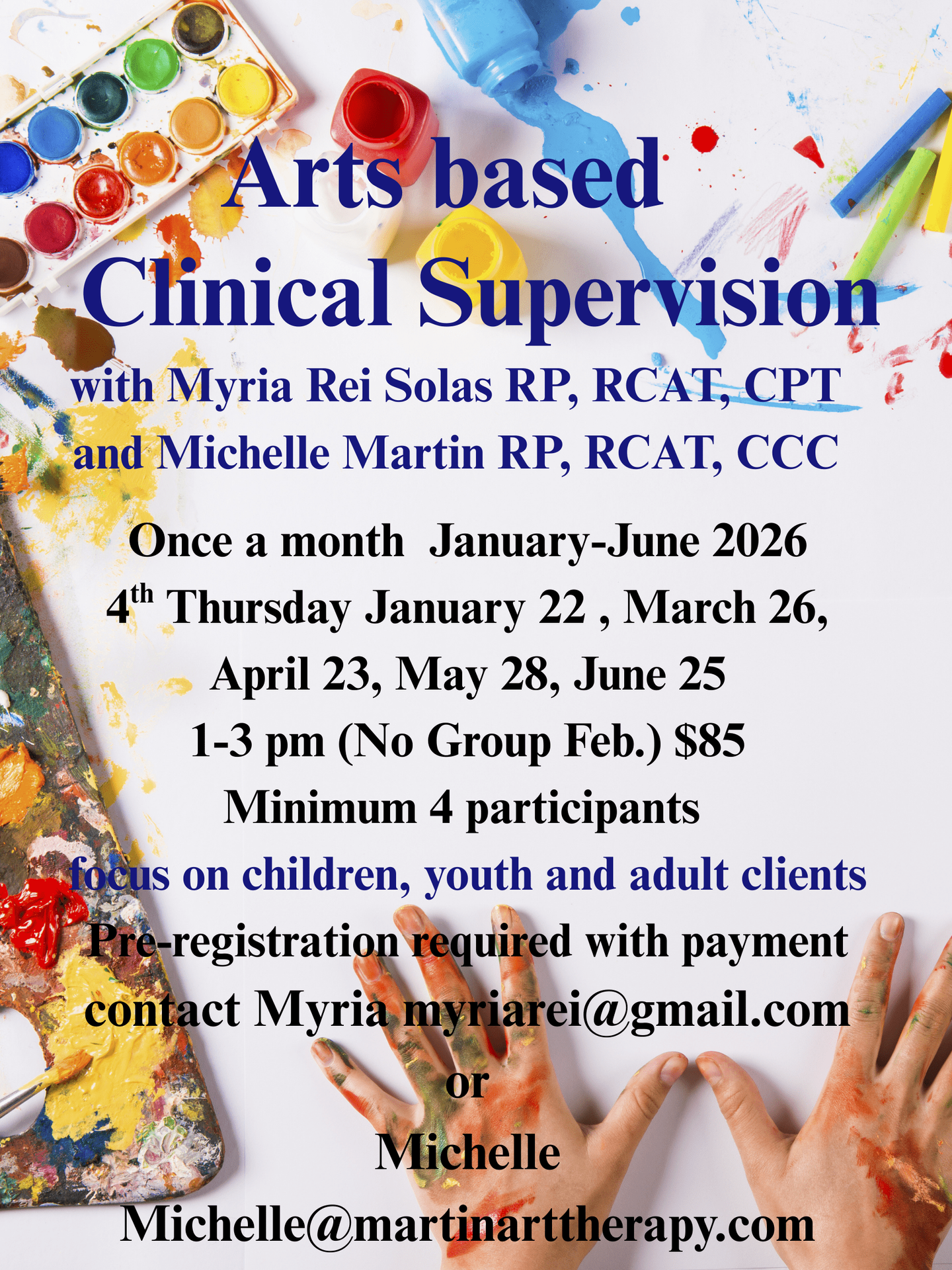We’re excited to offer a creative, process-oriented clinical supervision series designed for psychotherapists, social workers or art therapists who want to deepen their practice through art-making. Co-facilitated by Myria Rei Solas (RP, RCAT, CPT) of Art and Soul Therapy and Michelle Martin (RP, RCAT, CCC) of Martin Art Therapy and Psychotherapy, this group provides a supportive space to explore clinical material, strengthen professional identity, and engage with reflective art-making as part of supervision with a focus on working with children and adolescents.